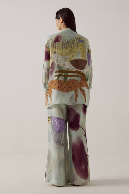 Blue Linen Mandarin Collar Mia Mirage Print Shirt
