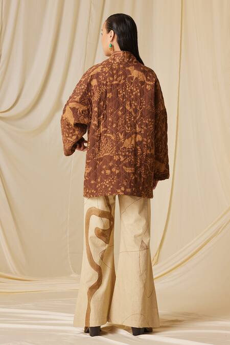 Brown Cotton Collared Miniature Print Quilted Jacket