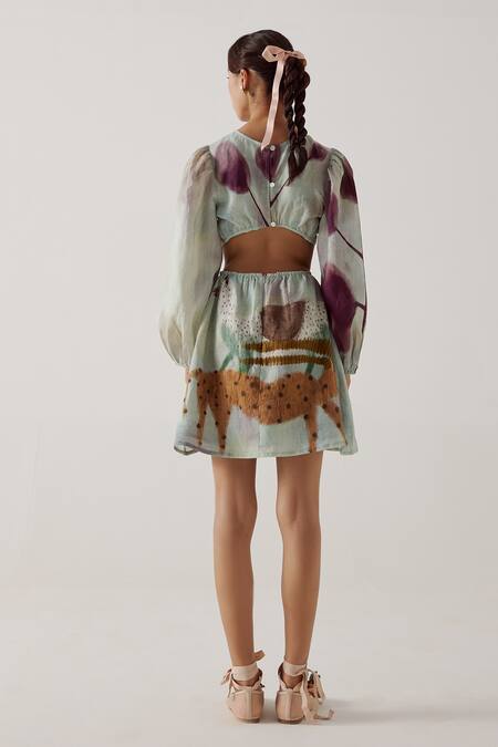 Backless design with a cut-out detail, Flared skirt enhances movement, Vibrant mirage print adds artistic flair