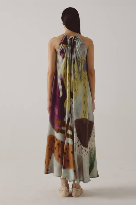 Multicolor midi dress featuring a halter neckline and a gathered design