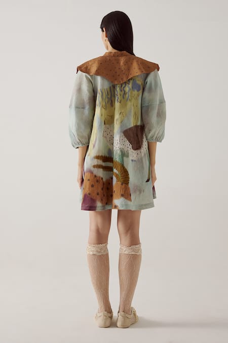 Blue umbrella dress featuring a mirage print and ruffle collar