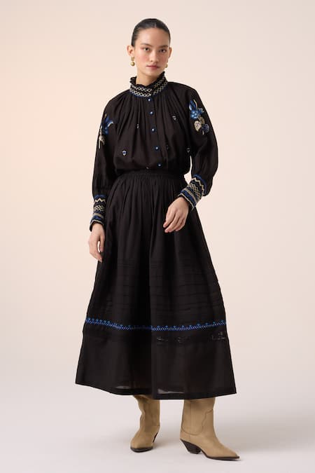 Black Cotton Embroidery Pintuck Skirt