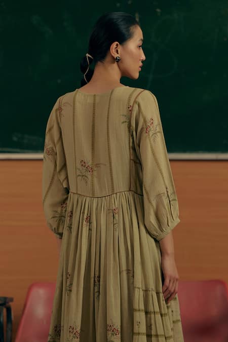 Beige cotton dress with regent floral print, contrast field pattern thread work yoke, puff sleeves & pleated flare.