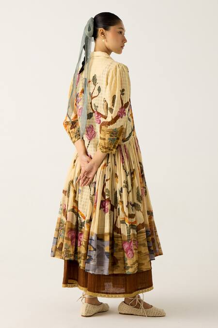 Ivory Cotton Collared, Round Neck Safari Print Button Down Jacket With Dress