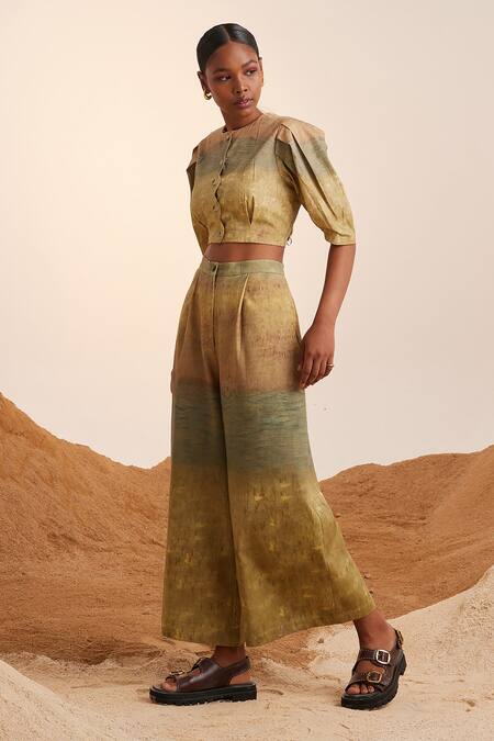 Yellow Cotton Satin, Linen Round Neck Scallop Impression Print Top