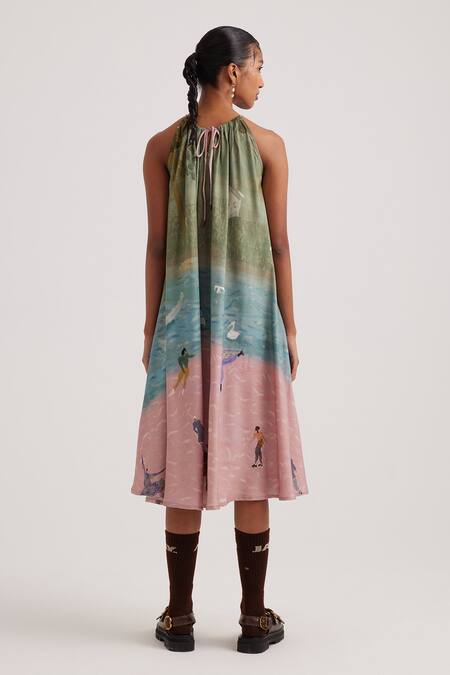 Multi-color midi dress featuring a skater print with a drawstring neckline