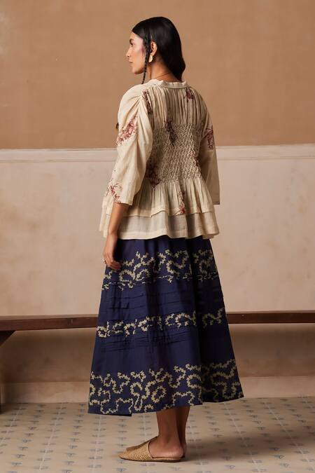 Indigo cotton skirt featuring contrast spiral print, tiered panels & pintuck details