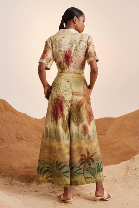 Beige linen overlap crop top featuring a notched lapel collar and half sleeves. Paired with matching printed wide-leg pants with side pockets and a button detail.