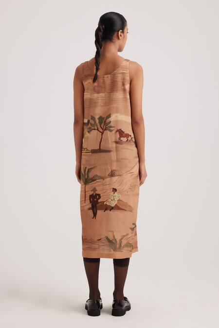Brown midi dress featuring an all-over derby print with a V-neckline and sleeveless design
