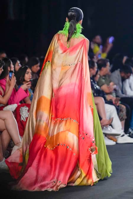 Tassel ornamented cuffs, Side tie-up detailing, Shaded dupatta with mirror work