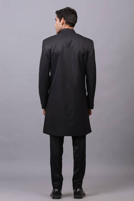 Black bandhgala highlighted with Buddhist mantra embellishments, stylized placket & full sleeves.