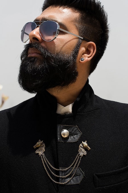 Antique gold tone horse motif carved cufflinks in circular design. Comes with layered chain double brooch & green stone encrusted lapel pin.