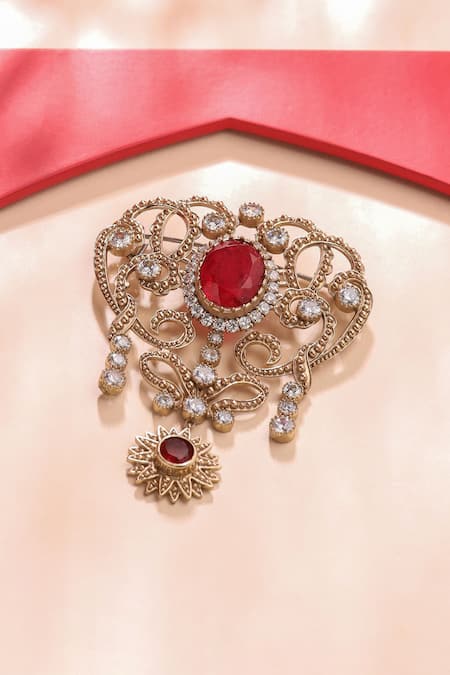 Large red gemstone centerpiece, Intricate brass design with glass stones, Delicate dangling detail with smaller gemstone