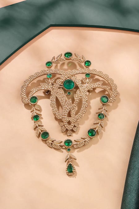 Gold brooch featuring floral leaf motifs embellished with green glass stones and a tassel drop