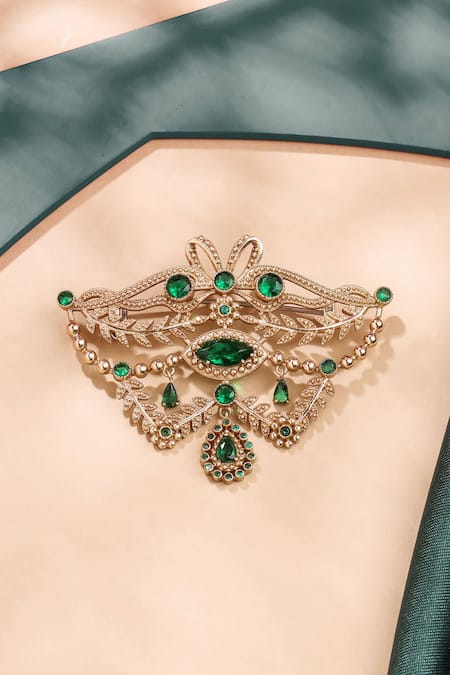 Intricate wirework carved in floral vine patterns, Embellished with green glass stones, Delicate detailing with a vintage appeal