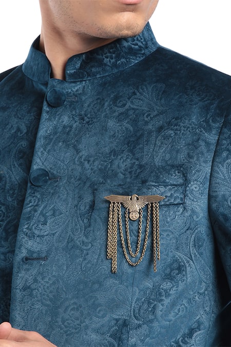 Antique gold plated rising eagle motif brooch enhanced crafted in brass metal with layered chain tassels. Comes with carved designer lapel pin.