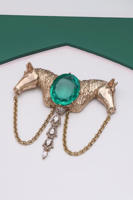 Gold toned brooch featuring a horses shaped design with intricate carved work and glass stones embellishment
