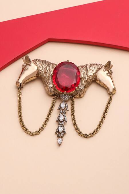 Gold toned brooch featuring a horses shaped design with intricate carved work and glass stones embellishment