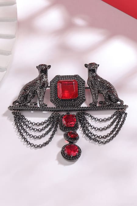 Buy_Cosa Nostraa_Grey Crystals, Chains Shaandaar Cheetah Carved Work Brooch _Online_at_Aza_Fashions