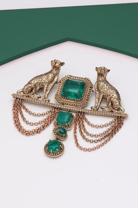 Gold brooch featuring a poised cheetah design with intricate carved work details and vibrant green glass stones embellishment
