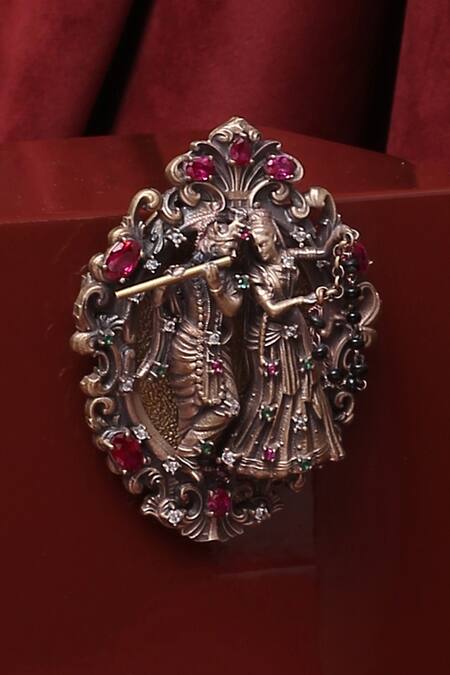 Antique gold brooch in brass metal base with carved Radha Krishna motif, stone embellishment & tassel drops.