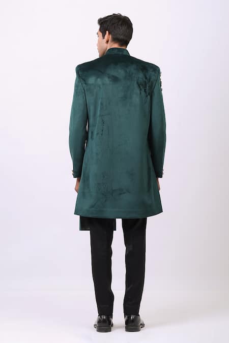 Bottle green bandhgala highlighted with embellishments, band collar & asymmetric hem.