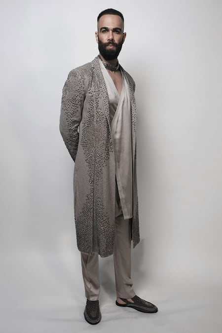 Grey Satin Embroidery Cosmati Wrap Around Kurta