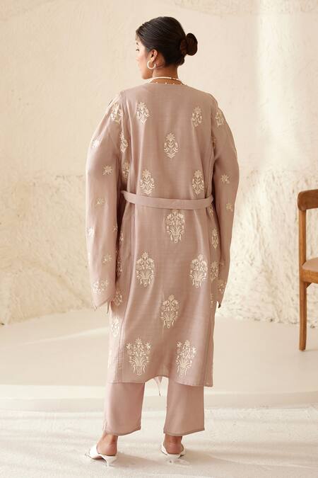 Beige kimono featuring floral hand block print and french knot embroidered placket. Paired with a sleeveless inner top and flared pants with side pockets.