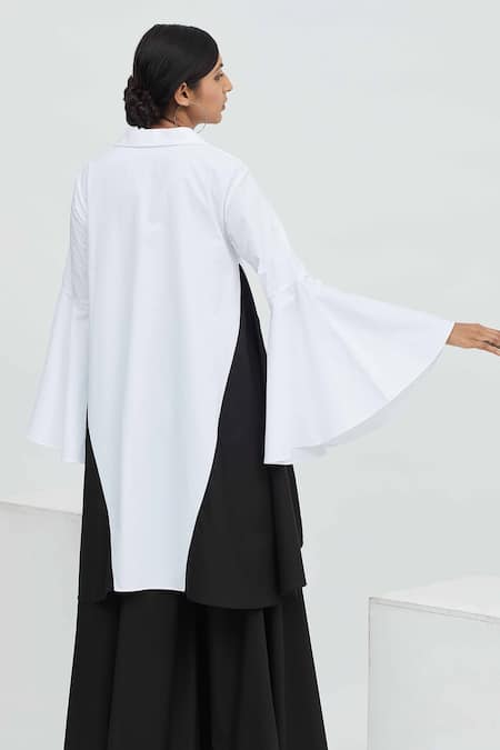 White tunic featuring an asymmetrical hem with a black panel at the bottom