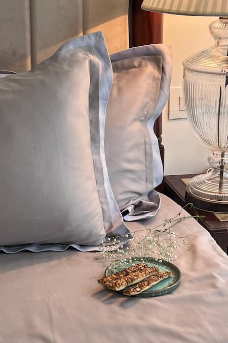 Silver bedsheet in a cotton base. Comes with pair of rectangular-shaped pillow covers with smoke blue border.