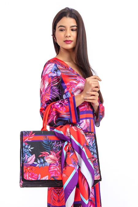 Multi-color tote bag in a geometric design with all-over leaf motif print & dual-handles.