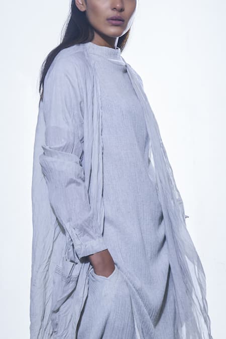 A white long overlay crafted from cotton organdy, featuring a crushed texture, long sleeves, and a front-open design with tie-up detail.