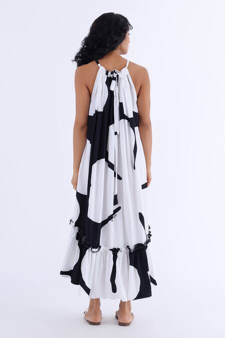 Black, white dress with halter neckline, hibiscus print & gathered detailing.