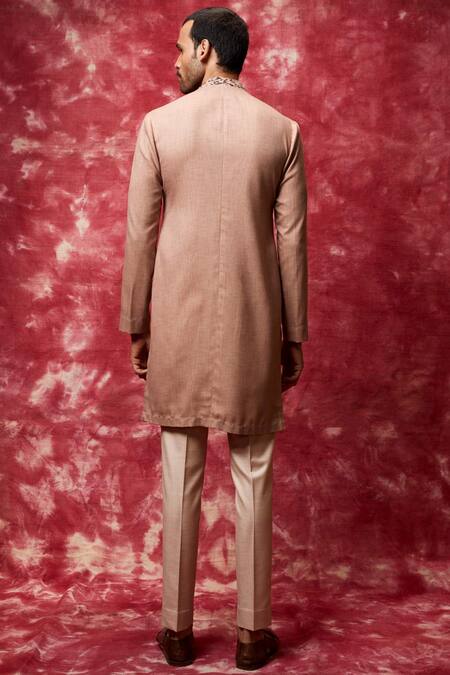 Blush pink short kurta with pleated drape panel. Paired with trousers.
