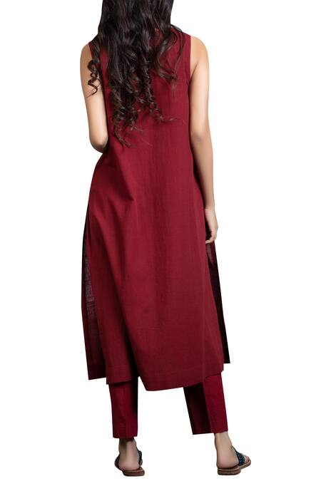 Maroon sleeveless kurta with side slits. Paired with plain pants & dupatta.