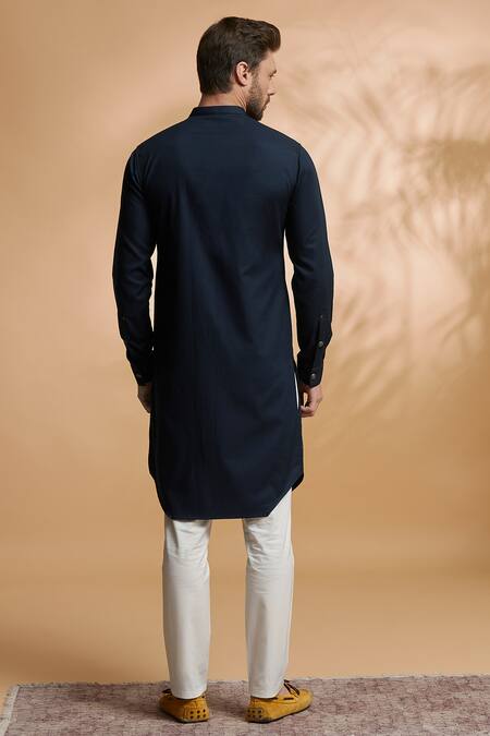 Navy blue kurta with front button placket and patch pockets. Paired with white straight pants.