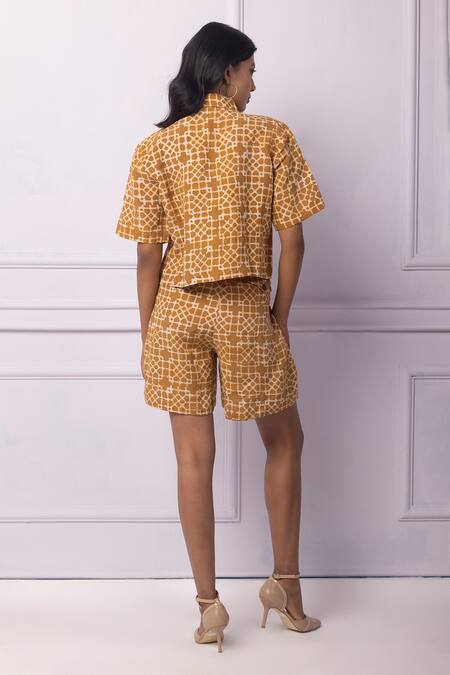 Muddy yellow shorts featuring batik print in cotton linen