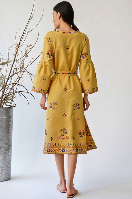 Mustard yellow dress with all over contrast thread work motifs. Comes with fabric belt.