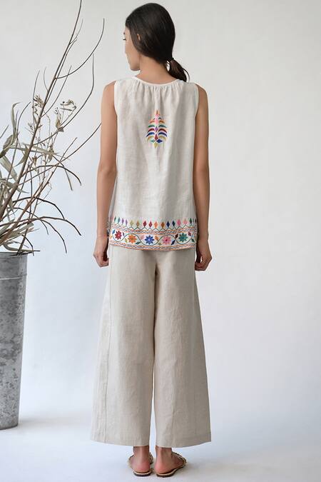 Buy_Umbar_White Cotton Linen Round Embroidered Top_at_Aza_Fashions