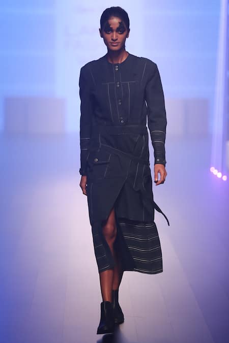 Buy_Virtuoso By Mekha And Anurag_Black Cotton Linen Embroidered Floral Round Striped Dress_at_Aza_Fashions