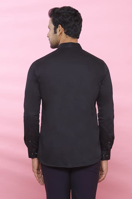 Black cotton shirt with contrast white piping detail & mandarin collared neckline.