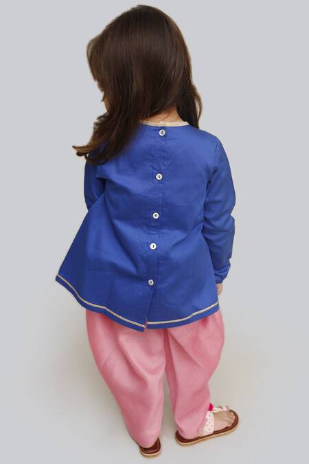 Blue kurta with embroidered lotus motif. Comes with pink dhoti pant.
