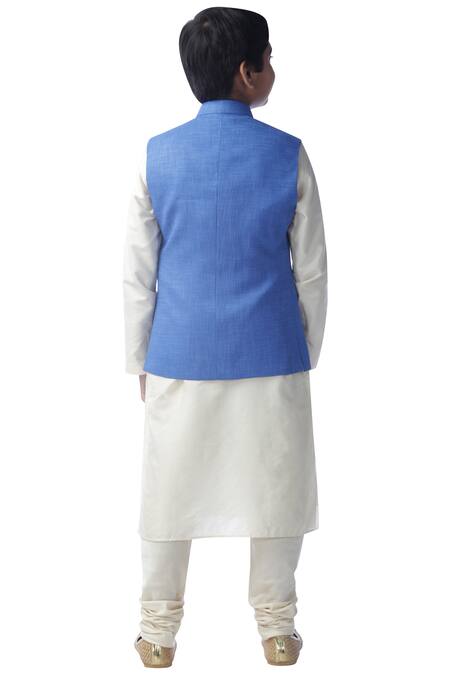 Blue bundi featuring welt pockets and metallic buttons. Paired with a cream cotton silk kurta and pant with side slits.