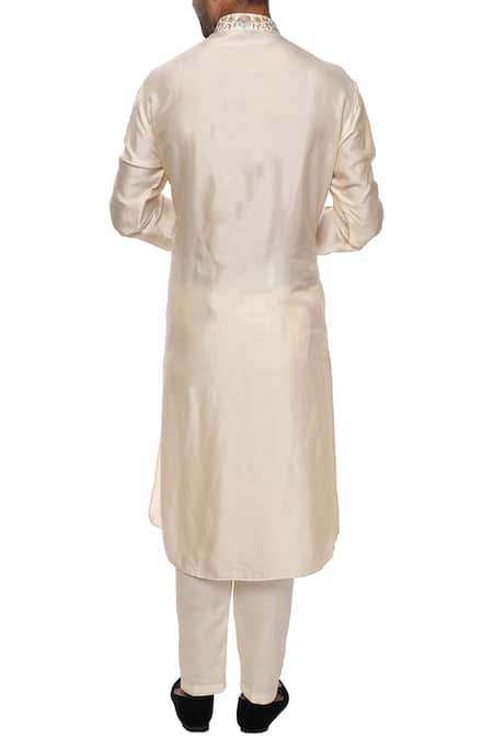 Cream straight kurta with threadwork on placket & collar. Comes with off white straight pant.