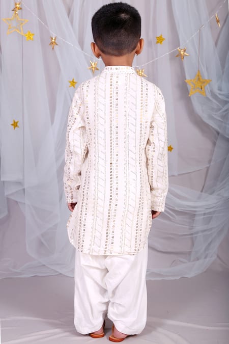 Off white kurta featuring intricate embroidery and a front button placket. Paired with a matching churidar for a complete look.