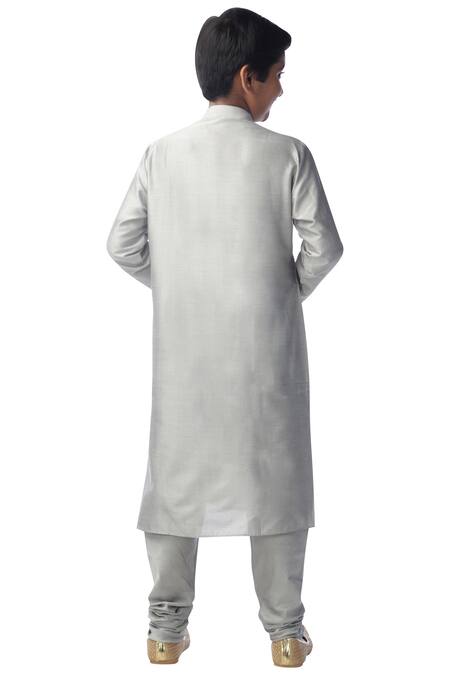 Grey kurta in cotton silk featuring full sleeves and a band neckline. Paired with matching pants and designed with side slits and side seam pockets.