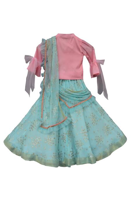 Blue lehenga saree with foil print all over. Paired with embellished top.