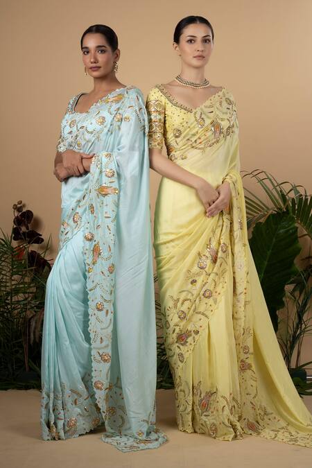 Scalloped hem saree, Note:The blue saree set worn by the other model is not for sale