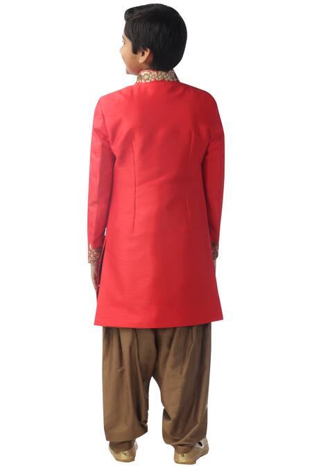 Buy_Kommal Sood_Red Cotton, Silk Embroidery Sherwani Kurta Set_Online_at_Aza_Fashions
