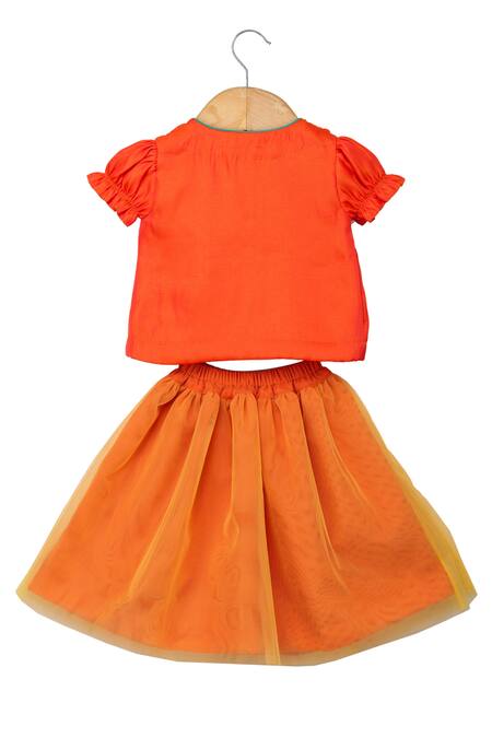 Orange overlap top with placement floral & butterfly motif embroidery. Comes with yellow flared skirt.